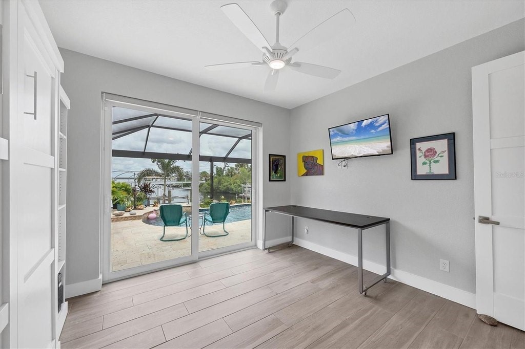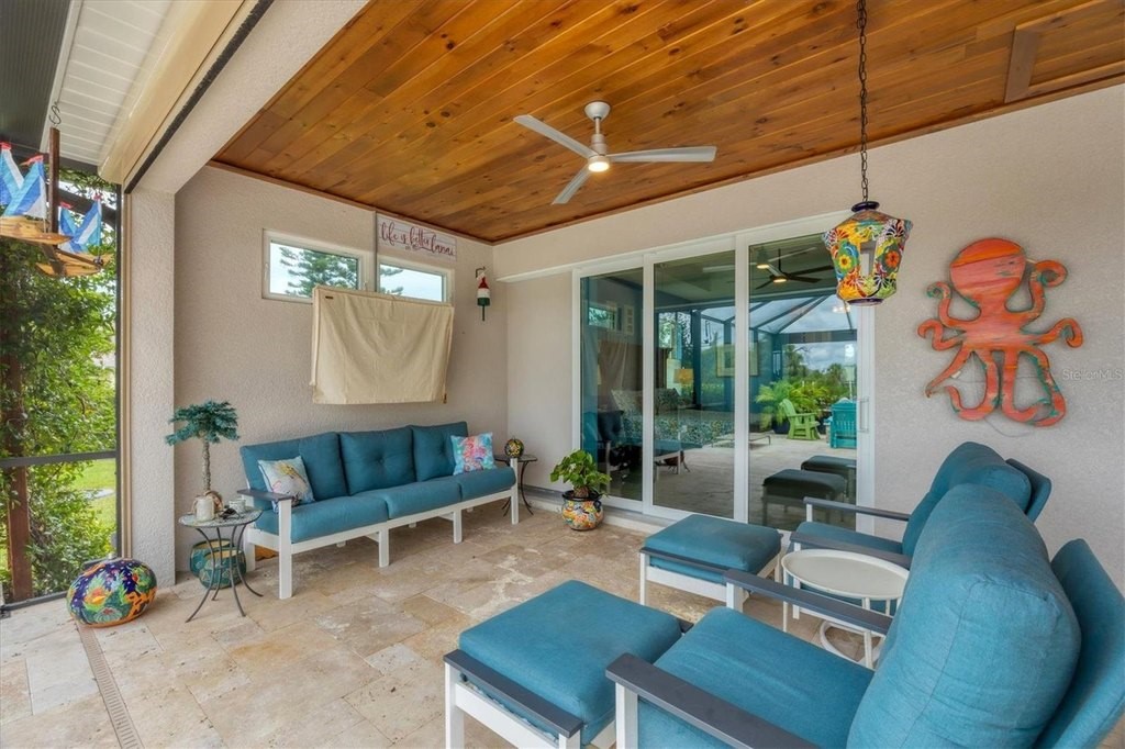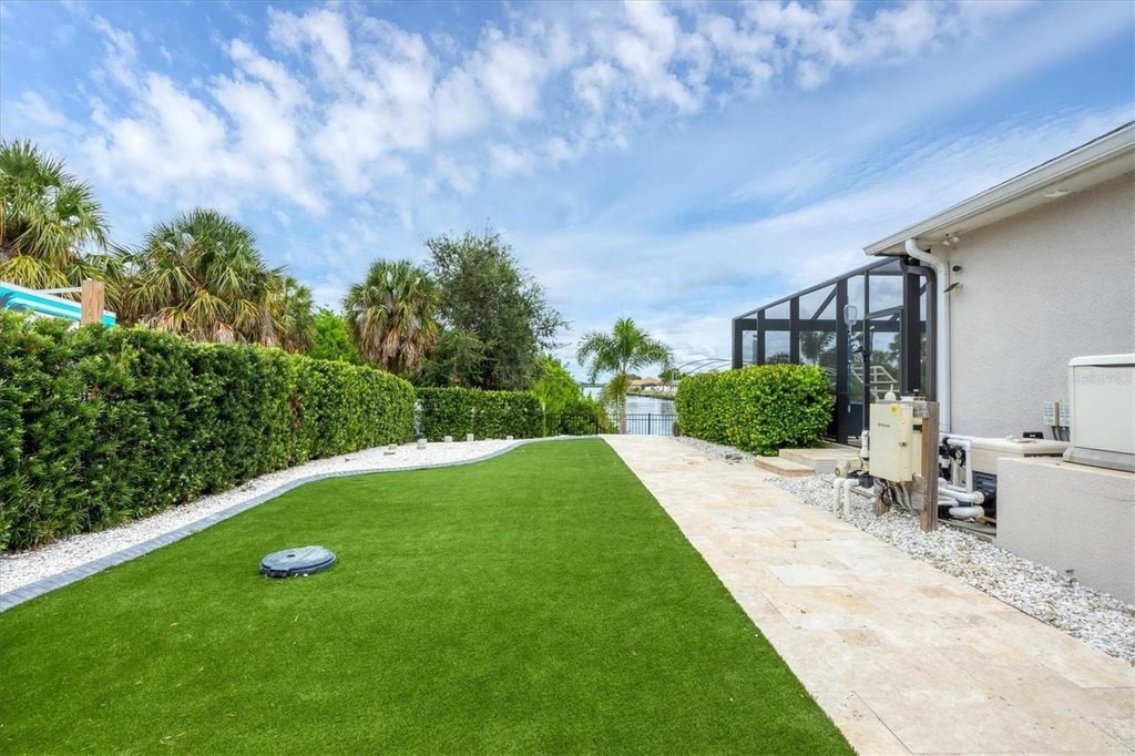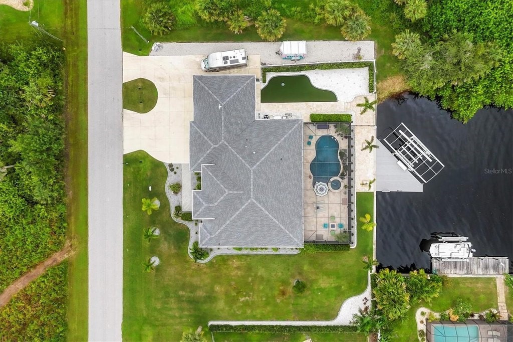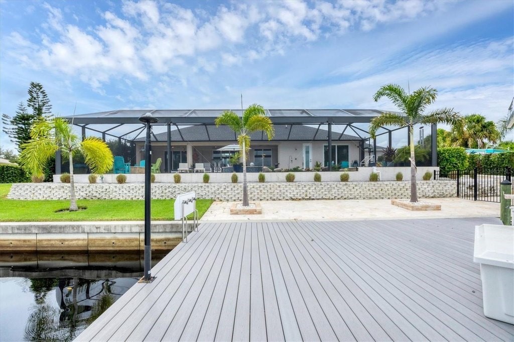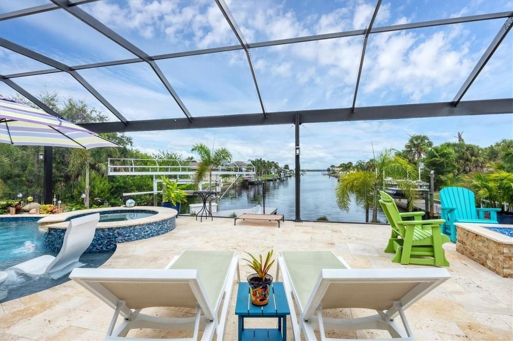 This 5-year young, high-end custom waterfront home offers an exceptional blend of luxury, durability, and coastal lifestyle. Centered on 2 lots, across 0.46 acres, the home provides 2,422 square feet of air-conditioned living space and a total of 4,181 square feet under roof. With direct Gulf access, the property is a boater’s dream—featuring a 10,000-pound covered boat lift and a spacious composite dock complete with a fish cleaning station. Inside, soaring ceilings, 8' shaker-style three-panel doors, multiple pocket-sliding glass doors and expansive windows flood the home with natural light, creating a bright, open atmosphere that feels both grand and inviting. The gourmet kitchen is equipped with a high-end KitchenAid appliance package including a gas cook top, separate built-in ice maker, stone countertops, gorgeous wood cabinetry with high-end trim, and a massive island perfect for entertaining. The fully tiled living space include three spacious bedrooms plus a versatile den or office, ideal for both remote work and guest accommodations. The saltwater pool and spa are enhanced by elegant fountain features and a lovely sun deck, complimented by travertine flooring both across the entire lanai as well as dockside. Impact-resistant, hurricane-rated doors, windows, and Fenetex motorized screens ensure both style and security. A whole-home generator powered by a 500-gallon buried propane tank services the built-in gas fireplace, cooktop, and outdoor grill, offering peace of mind and year-round comfort. With stunning sunrise and sunset views, a 4+ car garage, and an RV pad equipped with 50-amp service and concrete anchors, this home is a true coastal sanctuary built for refined living. Be sure to explore the extensive list of premium upgrades and thoughtful extras that make this property truly one-of-a-kind.